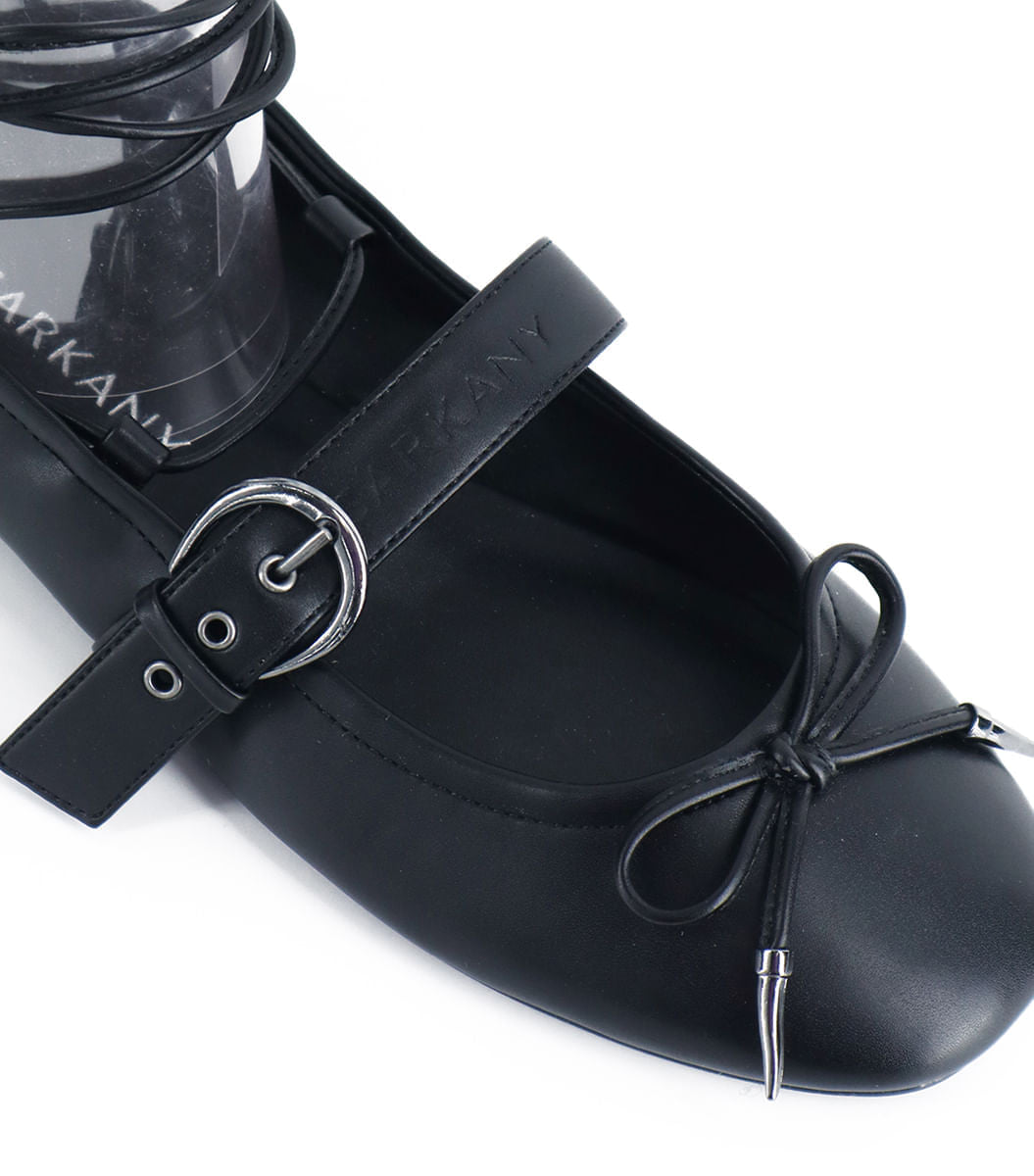 Esta balerina farmer negra está hecha con fibras de origen animal. Tiene una tira gitana en el talón, una tira con hebilla en el empeine y un detalle de cordón con dijes en la puntera. Además, la suela de goma antideslizante te garantiza un confort que dura todo el día.