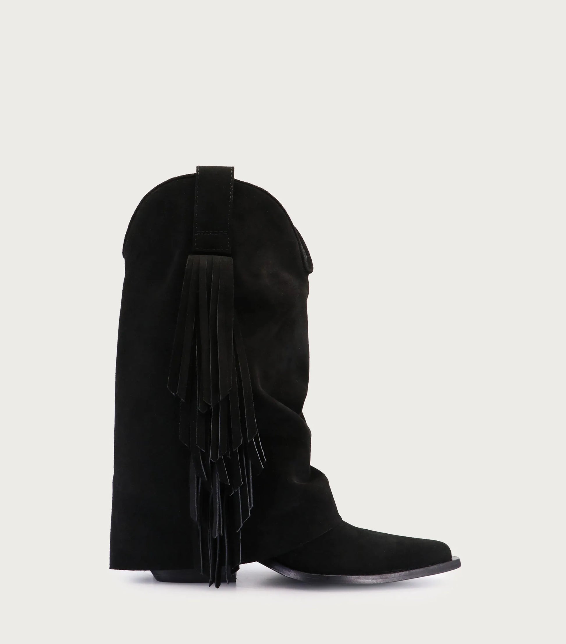 Bota RILO de gamuzón negro con caña volcada y flecos estilo texano auténtico. Horma en punta y forrería de fibras animal friendly para mayor comodidad y sostenibilidad. Taco de 5,5 cm, caña de 27 cm y circunferencia de 36 cm (talle 36).
